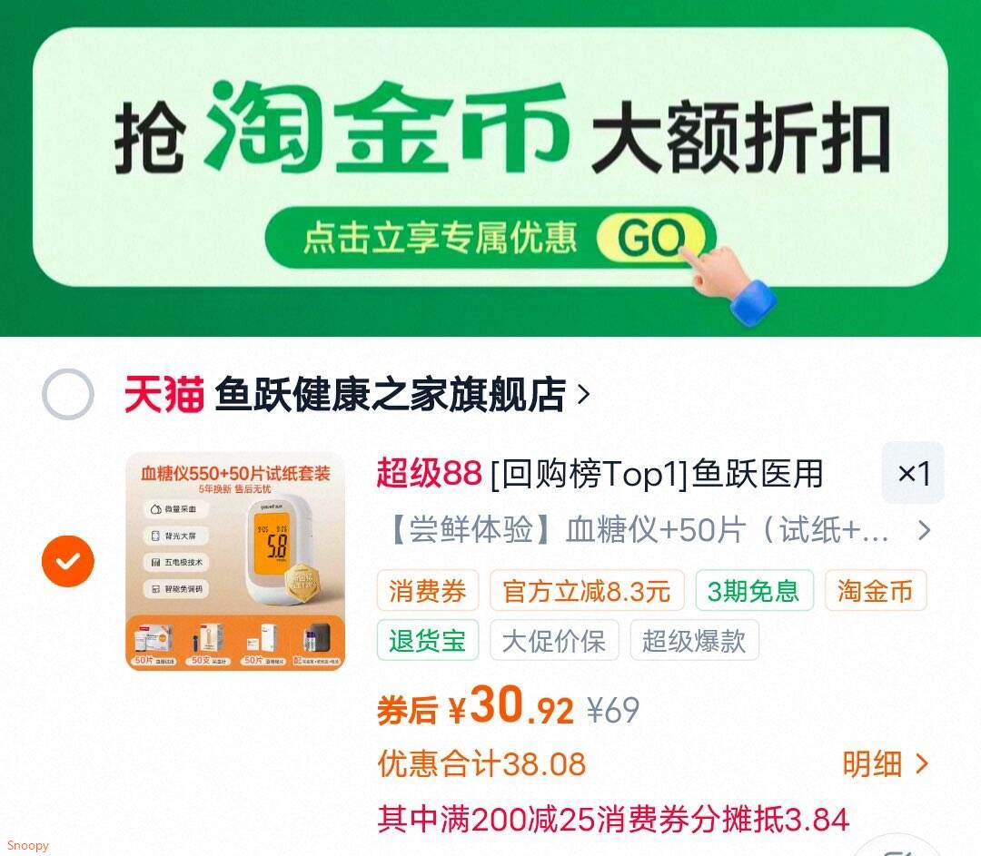 鱼跃血糖测试仪赠50试纸50针 30.9元发报员Z2026年04月10日 14:150举报 下拉详情 鱼跃血糖测试仪 贈50试纸 50针30.9元 不用来回跑 省时省力省钱------1先領奍加车1件叠88VIP 200-25消废奍https://m.tb.cn/h.iM7AdFS复制文案