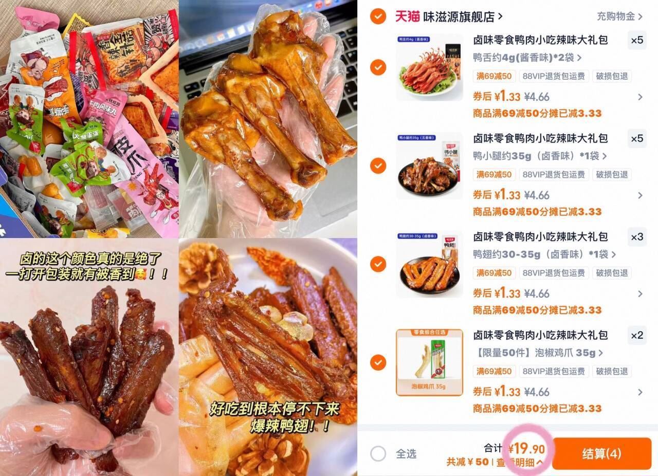 味滋源卤味零食鸭腿/凤爪…啪15件 19.9元发报员Z2026年04月10日 14:350举报 1.3/件 味滋源卤味零食 -鸭腿/凤爪…啪15件19.9元r几十种可选!!肉食控闭眼冲https://m.tb.cn/h.iMiD4XS复制文案