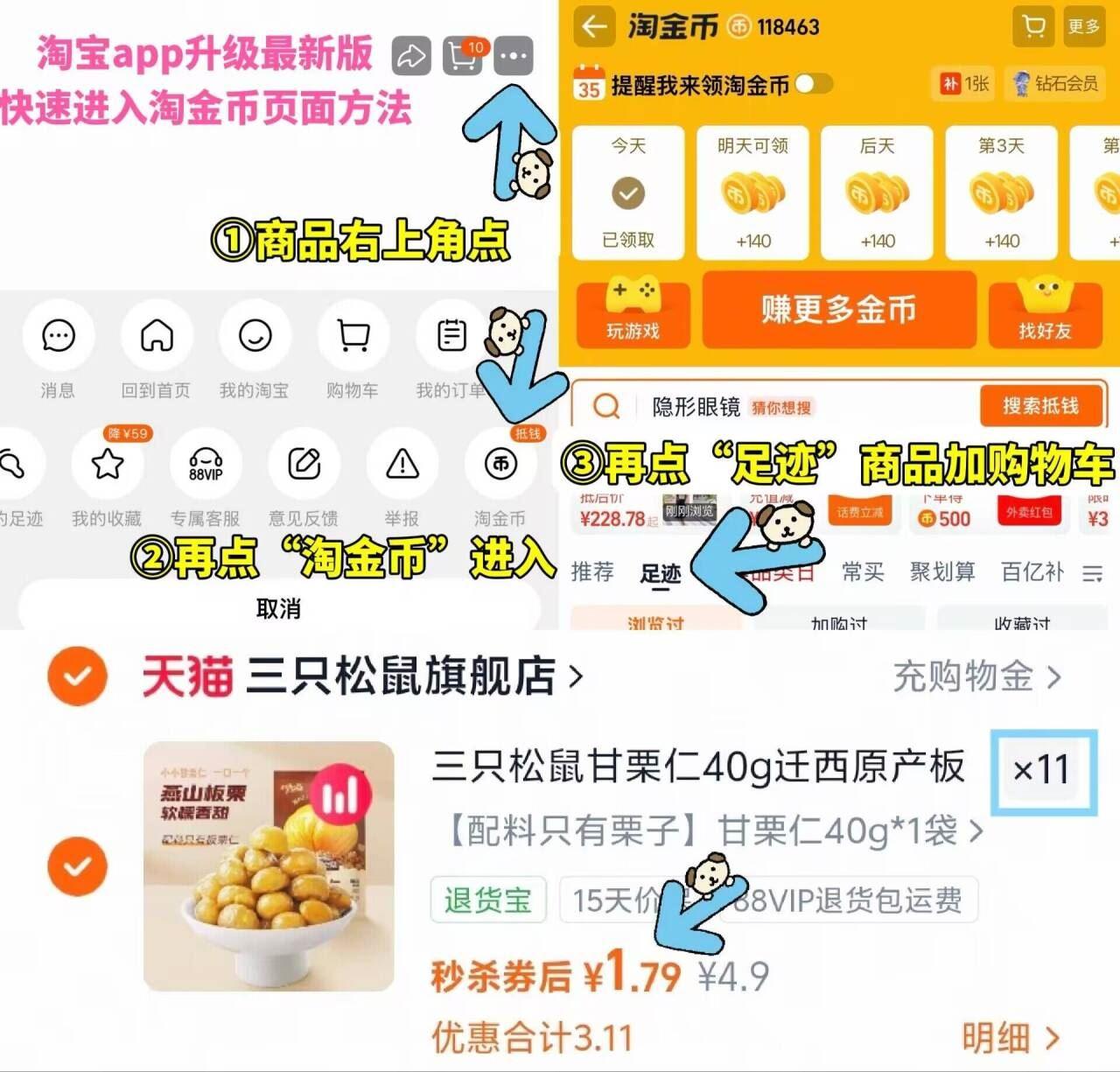 三只松鼠板栗仁40g*11袋 拍11件 19.6元发报员Z2026年04月10日 18:570举报 拍11件19.6元需叠0.14淘金币免剥壳开袋即食!三只松鼠官旗---【三只松鼠】板栗仁40g*11袋①如图点右上角3个点 选淘金币②再点足迹-找到商品加车11件https://m.tb.cn/h.iNtD4FH复制文案