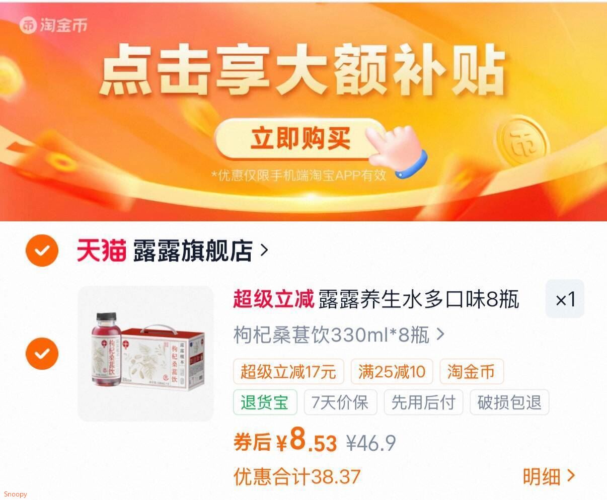 露露枸杞桑葚饮330ml*8瓶 8.5元发报员Z2026年04月13日 10:090举报 下拉详情拍8.5元,折1/瓶 露露 枸杞桑葚饮330ml*8瓶https://m.tb.cn/h.iLozeoo复制文案