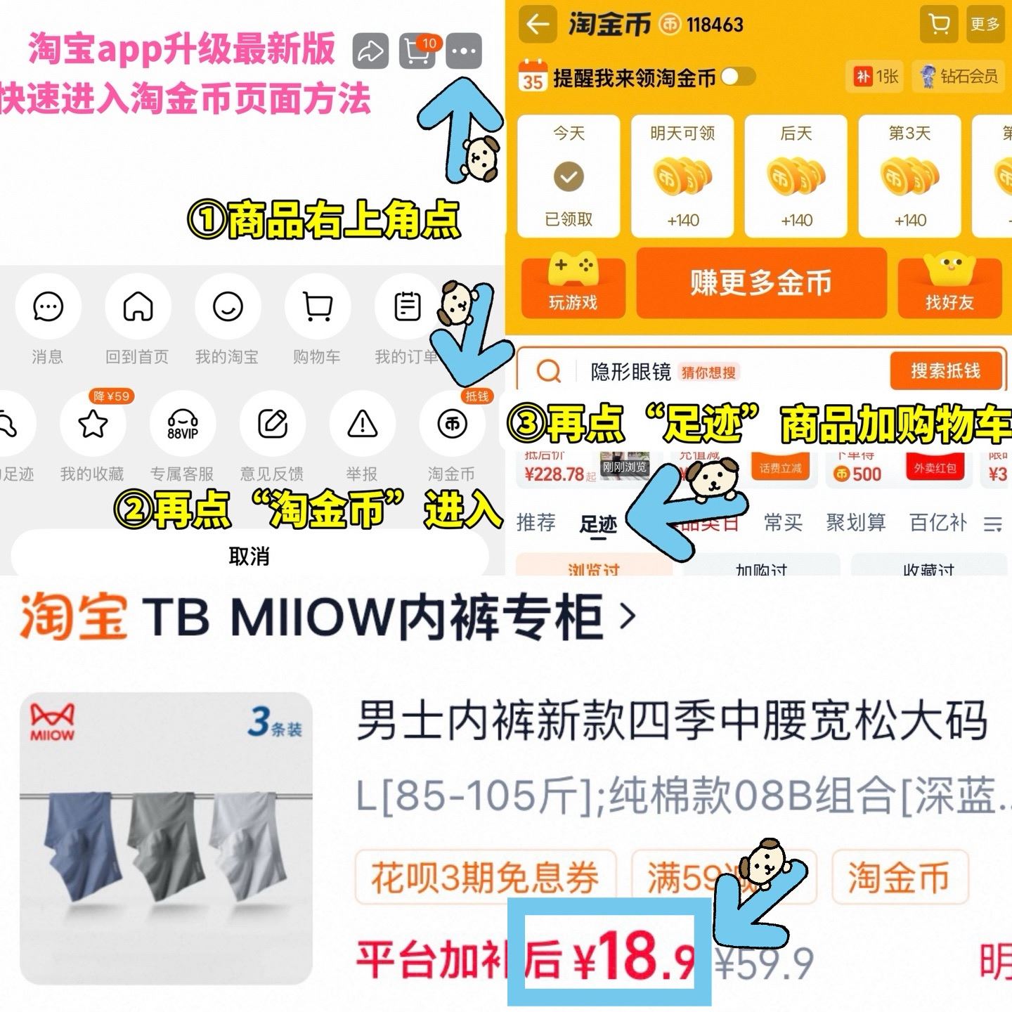 ①如图点右上角3个点,选淘金币