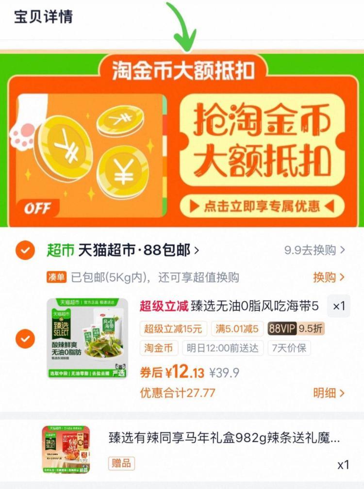速上海/北京等地有赠品 卫龙 海带酸辣味560g12元 下単加赠发报员Z2026年04月13日 15:460举报 1速上海/北京等地有赠品卫龙 海带酸辣味560g12元下単加赠 卫龙辣条礼盒982g下滑详情,到淘金币页面拍https://m.tb.cn/h.iLEftM7复制文案