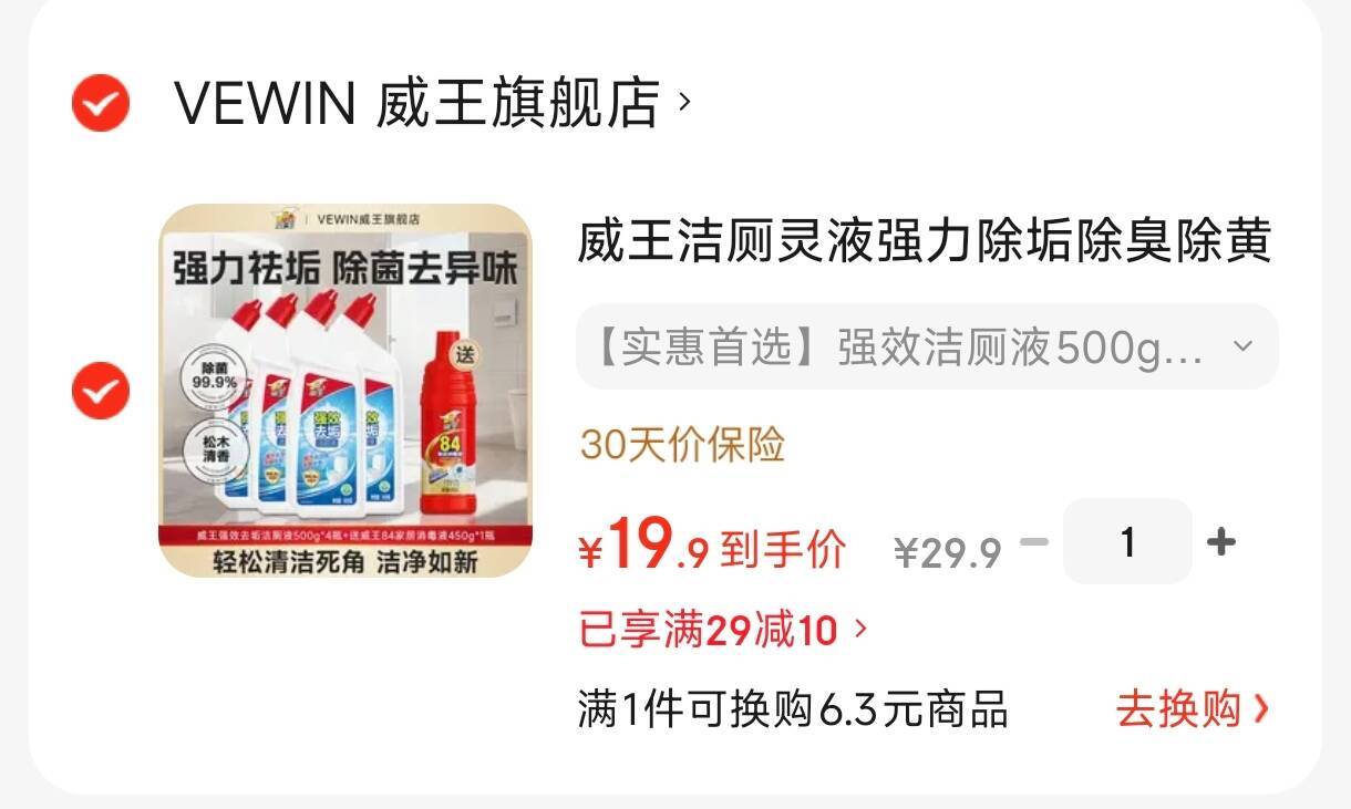 威王洁厕灵500g*4瓶 赠84消毒液450g 19.9元发报员Z2026年04月13日 17:050举报 威王洁厕灵500g*4瓶 赠84消毒液450g19.9元https://u.jd.com/jD2mBxe复制文案