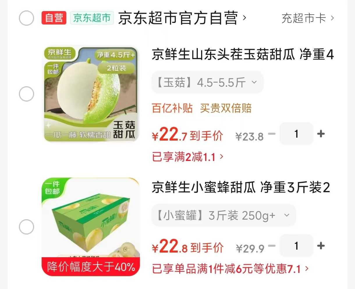 京鲜生 小蜜蜂甜瓜 净重3斤 单果250g以上【22.8】