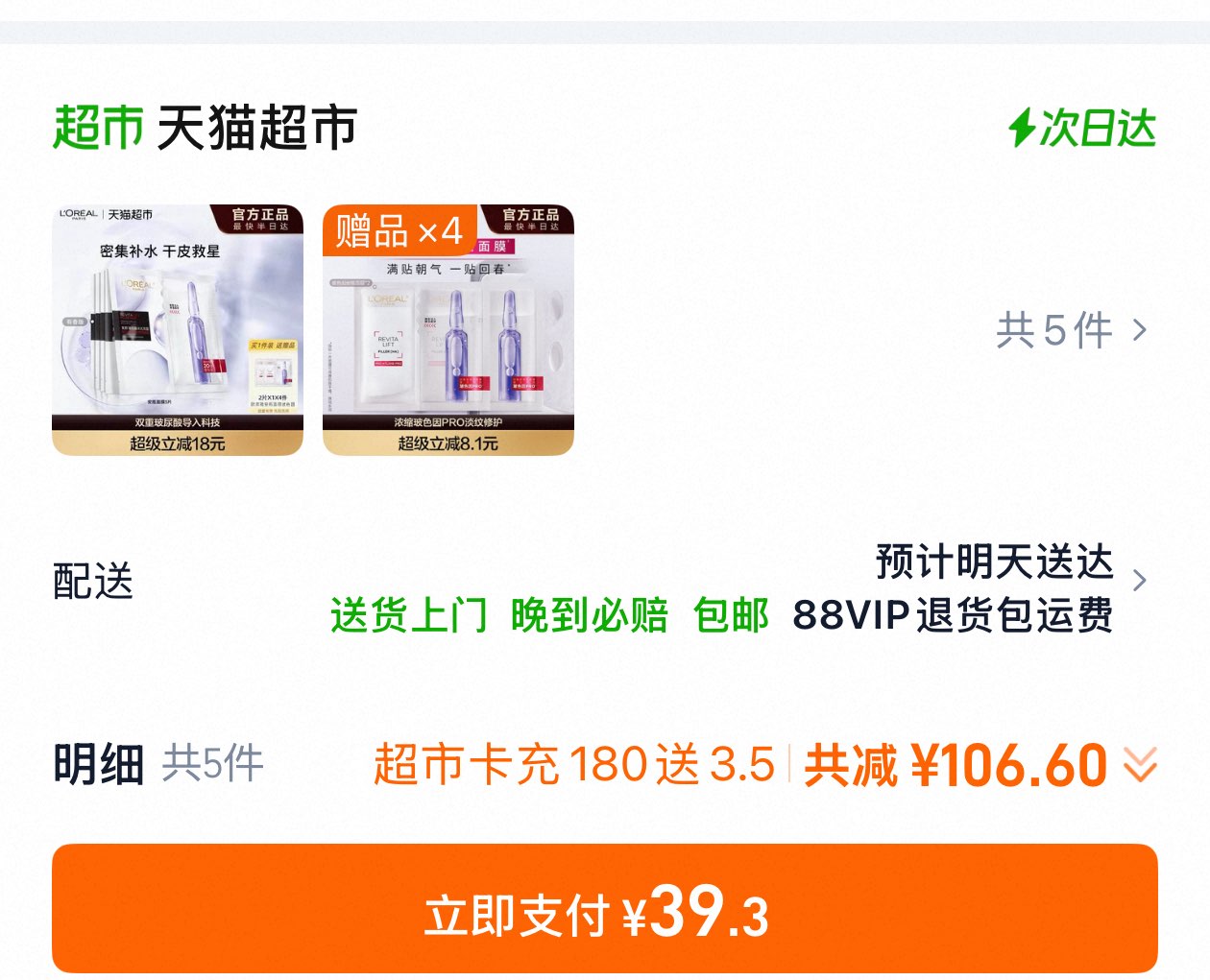 欧莱雅安瓶面膜13片 39.3元发报员Z2026年04月14日 12:420举报 猫超首页搜 欧莱雅猫超宠粉福利领30品牌金欧莱雅安瓶面膜13片主图进zbj弹9折加购一件金币页面再次加购够物车数量改1拍下39.3https://m.tb.cn/h.ioWVI76复制文案