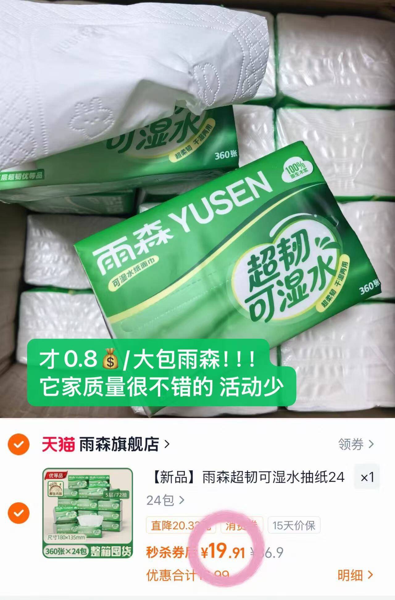 雨森超韧可湿水抽纸 19.9元发报员Z2026年04月14日 13:200举报 0.8元/包雨森超韧可湿水抽纸 这里 !19.9 得24大包!https://m.tb.cn/h.iLQL1ub-5层加厚的!它家质糧很不错的14点结束 哈 不囤货好扴抓紧! 复制文案
