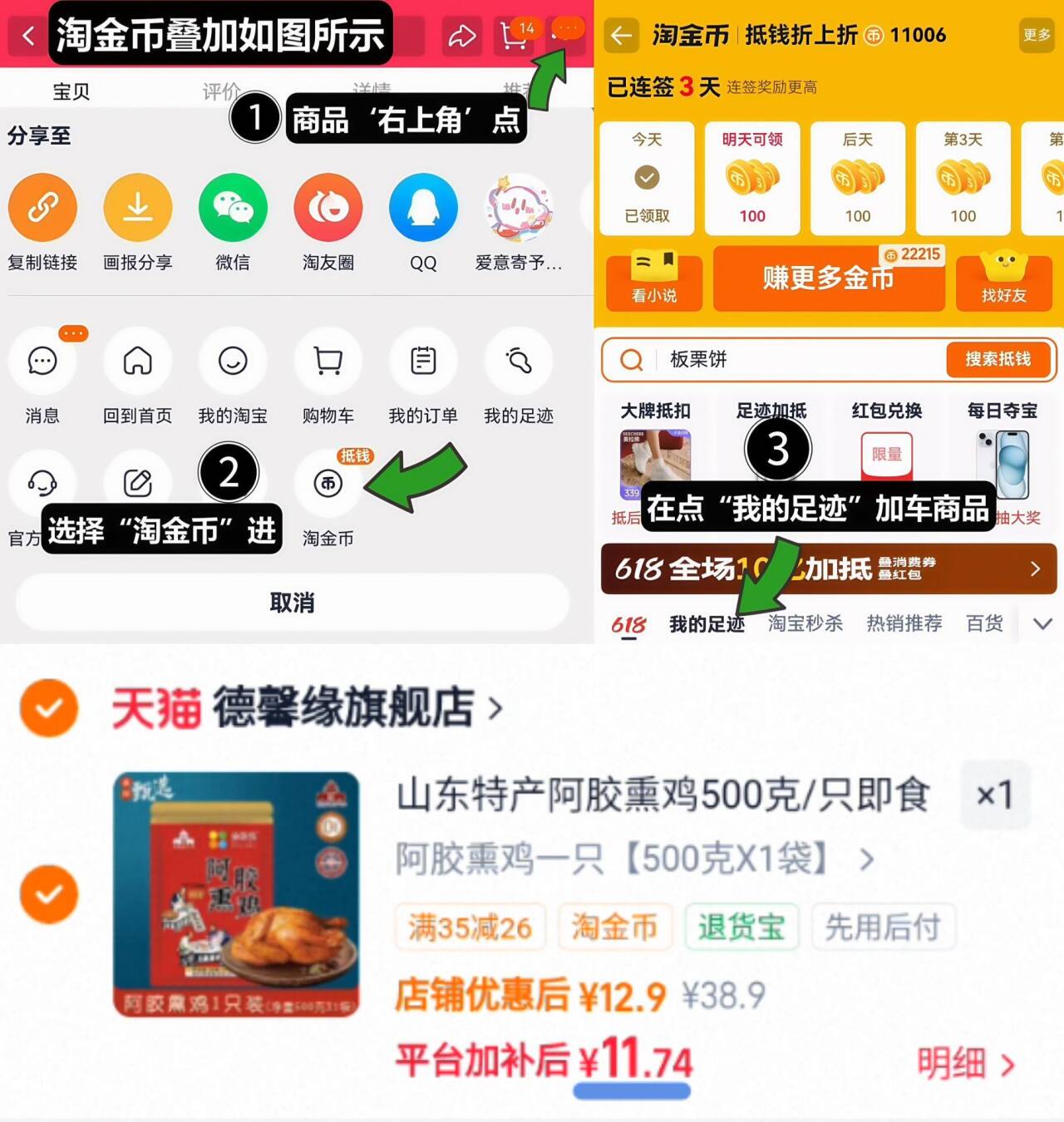 德馨缘阿胶熏鸡500g 11.7元发报员Z2026年04月14日 16:110举报 10.7元神圿 拍第1选项拍下11.7元!晒.图.饭1元【德馨缘】阿胶熏鸡500g①如图点右上角3个点,选淘金币②选我的足迹-找到商品拍https://m.tb.cn/h.iLNK5Hy复制文案