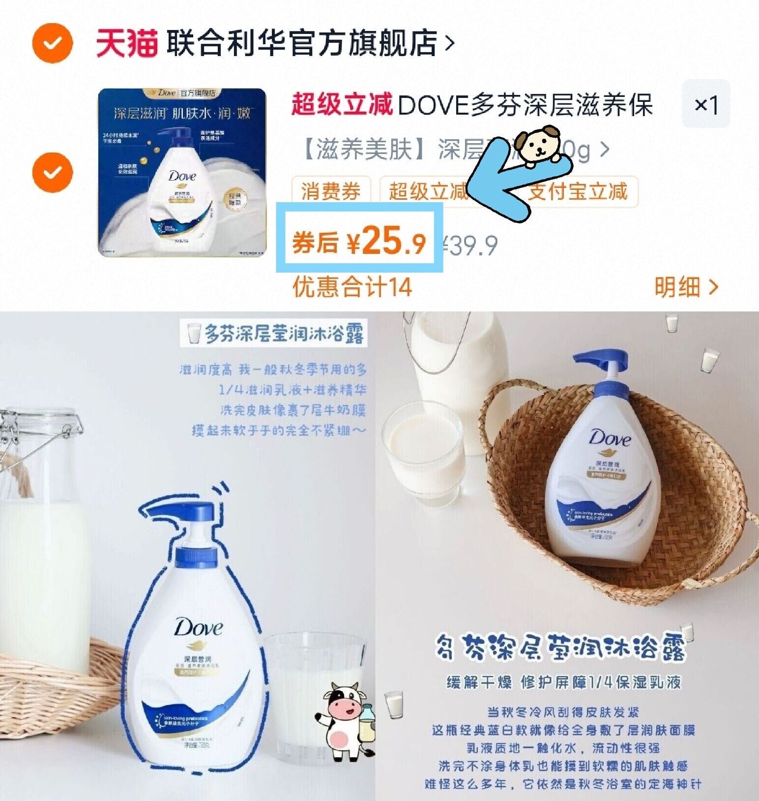 多芬牛奶滋润沐浴露730g 25.9元发报员Z2026年04月14日 20:060举报 快 多芬沐浴露25.9好圿!足足730g!一瓶能用很久---多芬牛奶滋润沐浴露730g复制这条信息打开手机陶宝https://m.tb.cn/h.ipvFD4q洗完香香嫩嫩的,不拔干复制文案