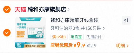 臻和亦康牙线棒50支*3盒 9.9元
