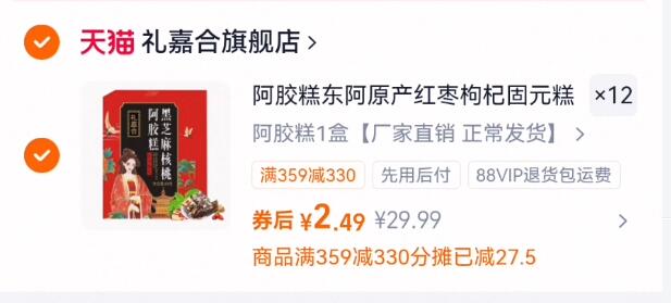 2.4元/盒!阿胶糕拍12件