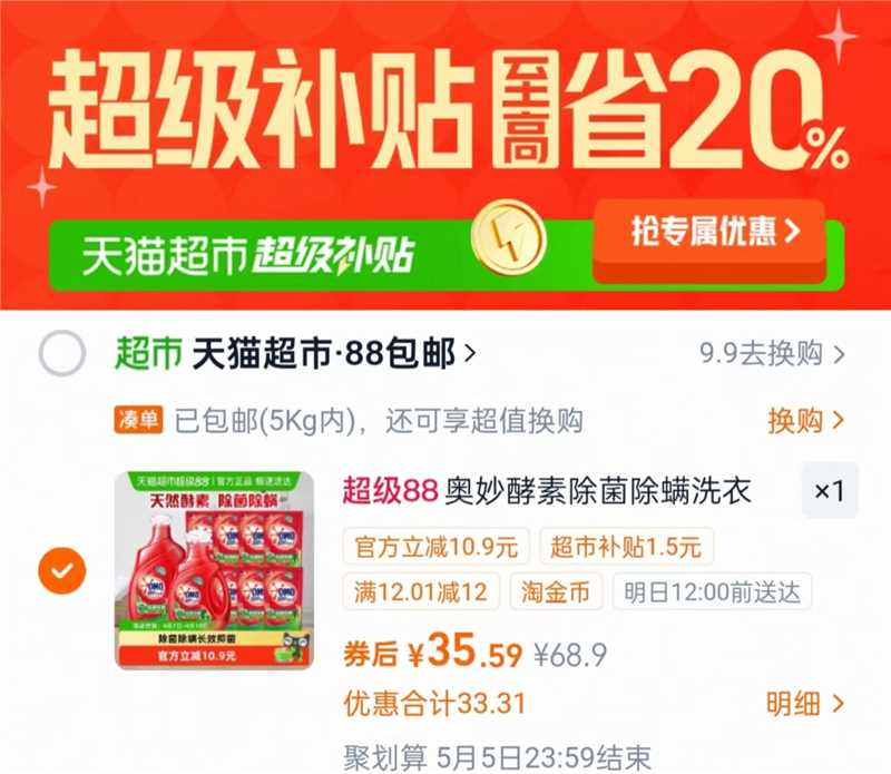 奥妙洗衣液13.5斤 2.6元/斤发报员Z2026年04月15日 00:370举报 奥妙洗衣液 13.5斤 . 需下滑至详情页进超级补贴天然酵素 除菌除螨超干净!折2.6/斤 消耗品好价就多囤┄https://m.tb.cn/h.iKZaj1f复制本段话到桃宝打开加勾复制文案