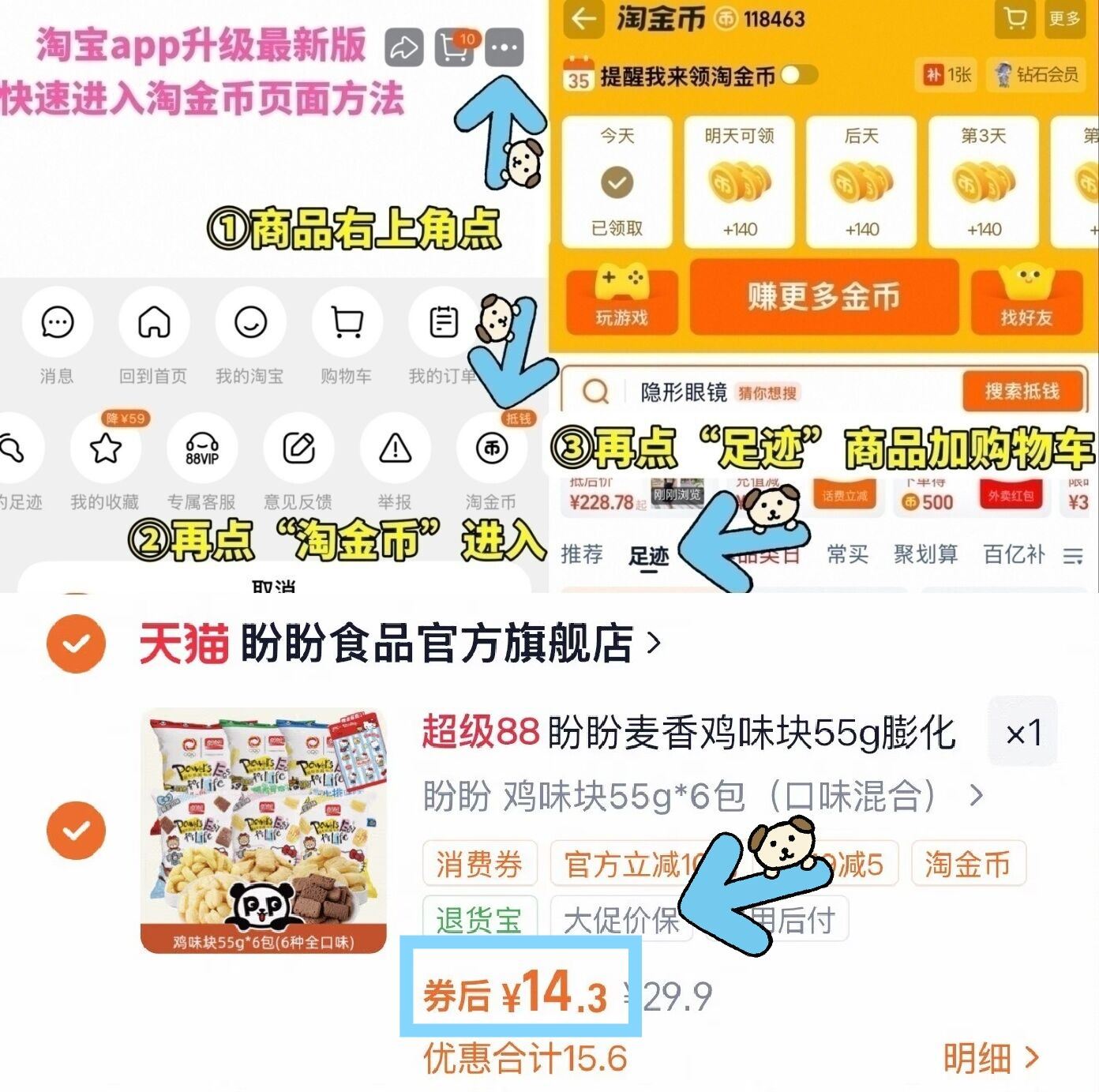 ①如图点右上角3个点选淘金币