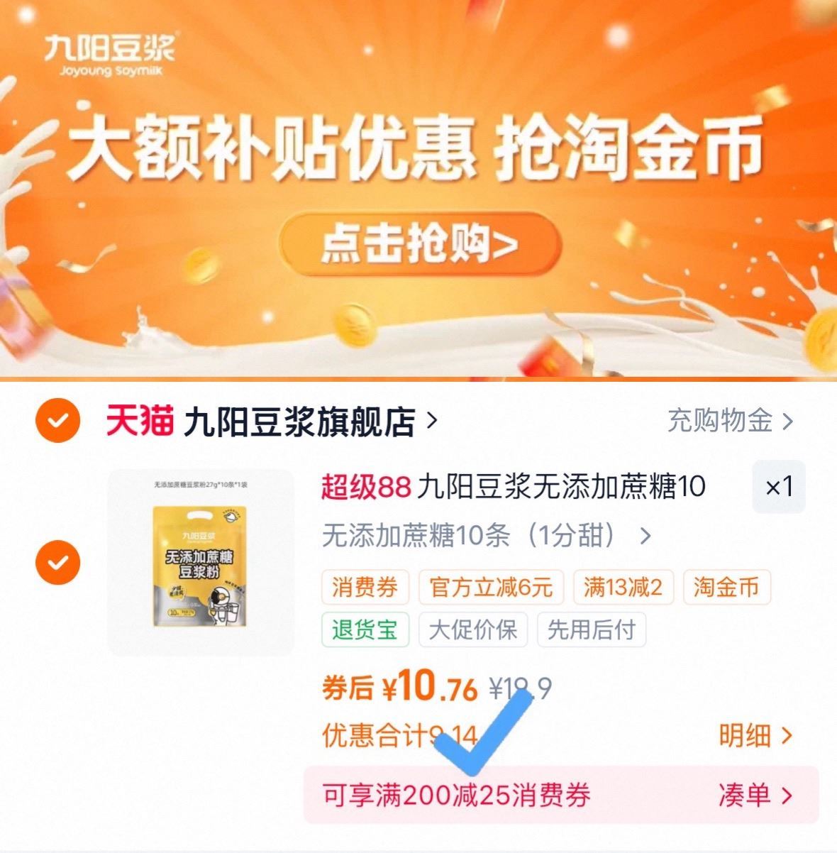 九阳蔗糖豆浆粉10条*27g 10.7元发报员Z2026年04月15日 14:130举报 10.7元 下拉淘金币 九阳蔗糖豆浆粉10条*27g搭配个面包 一整天都完美更符合国人体质的早八饮料-https://m.tb.cn/h.iKkHXzY复制文案