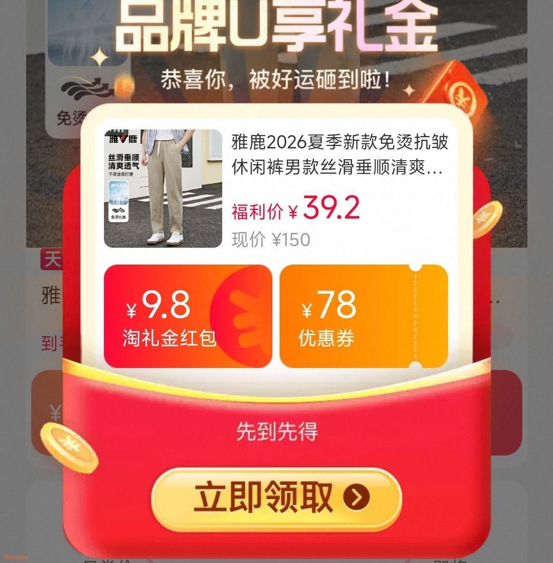 雅鹿絻烫抽绳弹力直筒裤 39.2元发报员Z2026年04月15日 14:500举报 39.2元双倍礼金史低 雅鹿 絻烫抽绳弹力直筒裤新歀冲量好价 专柜百来块絻烫抗皱 超舒适百搭耐看~-https://m.tb.cn/h.iLJIg2x复制文案