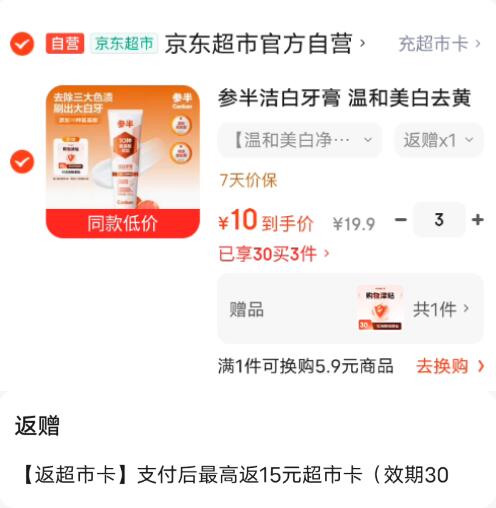 相当于5元到手3支 拍3件30元 饭15超市卡 赠10元购物津贴 参半洁白牙膏发报员Z2026年04月15日 16:130举报 相当于5元到手3支拍3件30元,饭15超市卡赠10元购物津贴参半洁白牙膏 120ghttps://u.jd.com/jgB9yJn 购物津贴第8天以后找喀服可以换成亰东E卡复制文案