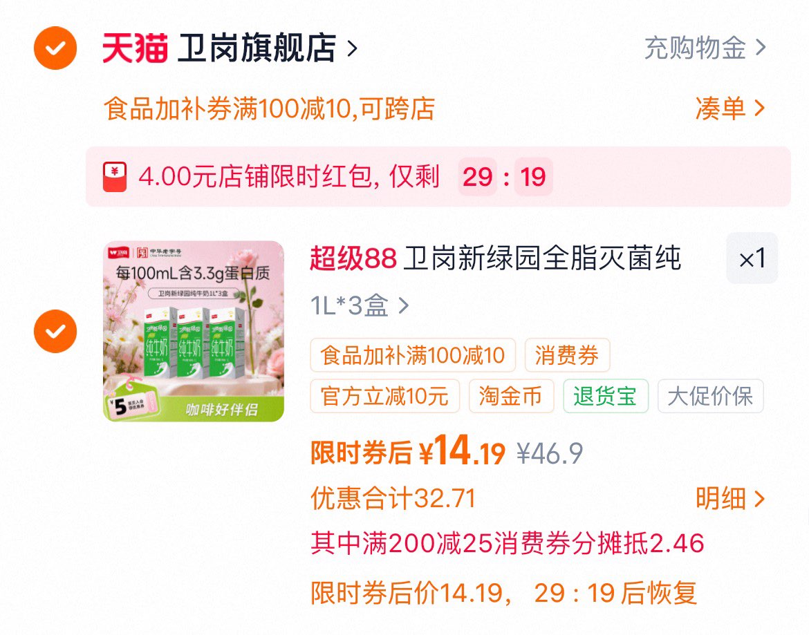 卫岗新绿园全脂纯牛奶1L*3盒14.19