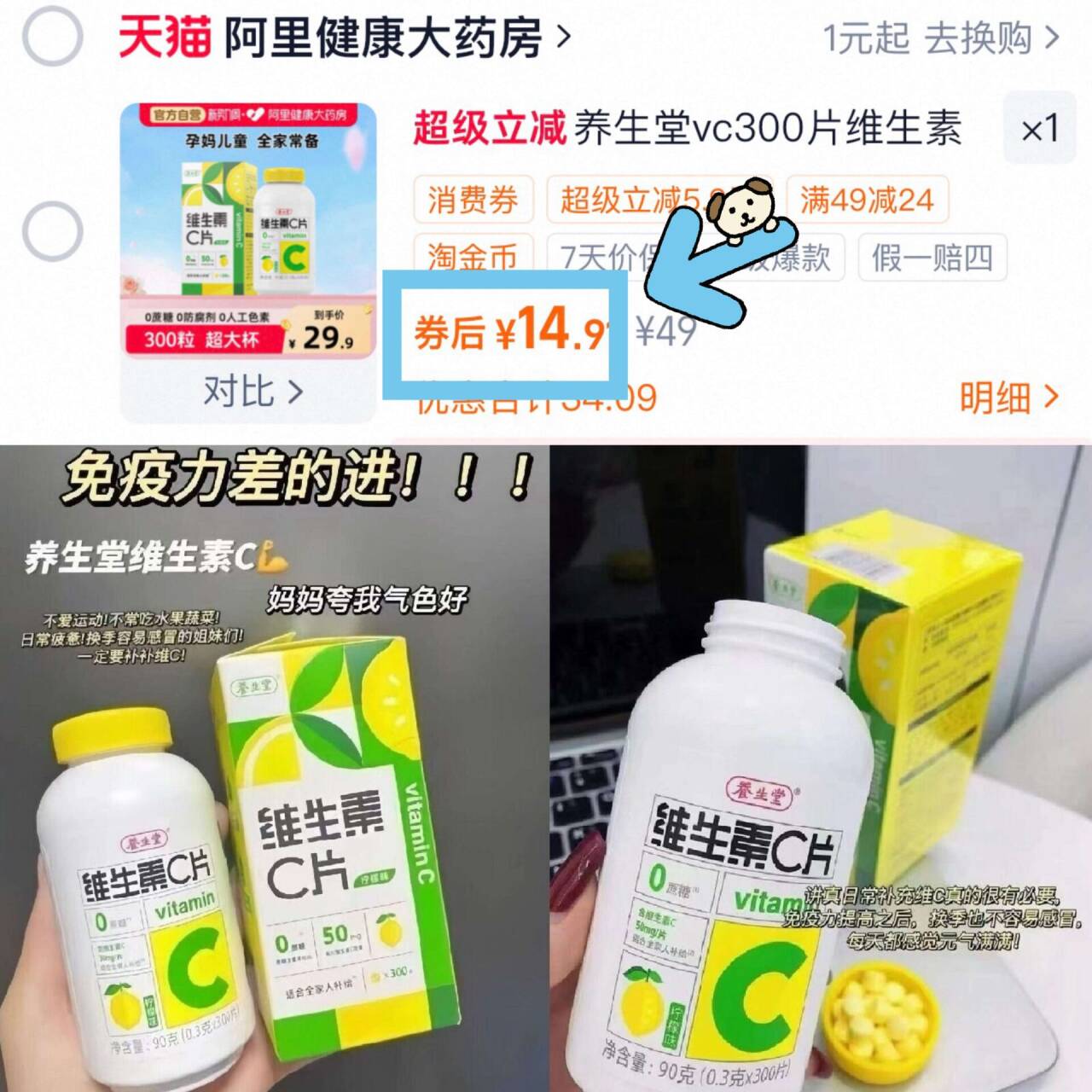 养生堂维生素c片300片1瓶 14.9元发报员Z2026年04月17日 21:310举报 300粒超大罐的!才14.9元! 4分/粒 真正的纯天然VC---养生堂维生素c片300片1瓶复制这条信息打开手机陶宝https://m.tb.cn/h.iKXwmFxVC含量高 每天一颗增强免疫复制文案