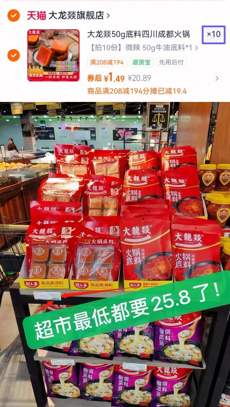 大龙燚牛油火锅底料50g*10袋 拍10件 14.9元发报员Z2026年04月17日 23:470举报 0点1.4元/袋 拍10件14.9元 超市同款200g要25.8元【大龙燚】牛油火锅底料50g*10袋https://m.tb.cn/h.iJLsYXT复制文案