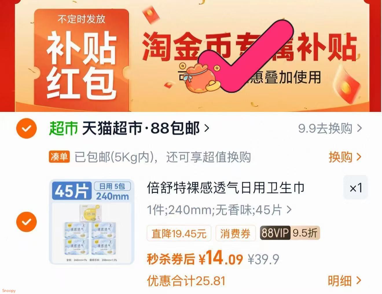 速倍舒特日用卫生巾45片 14元
