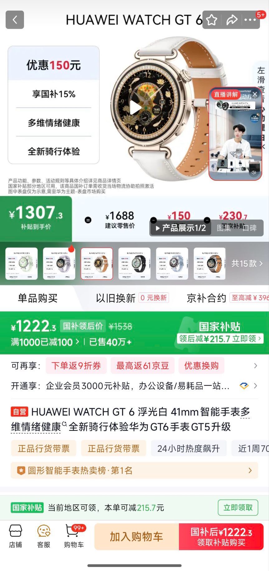 自营华为 WATCH GT 6 41mm 智能手表,guo补1222