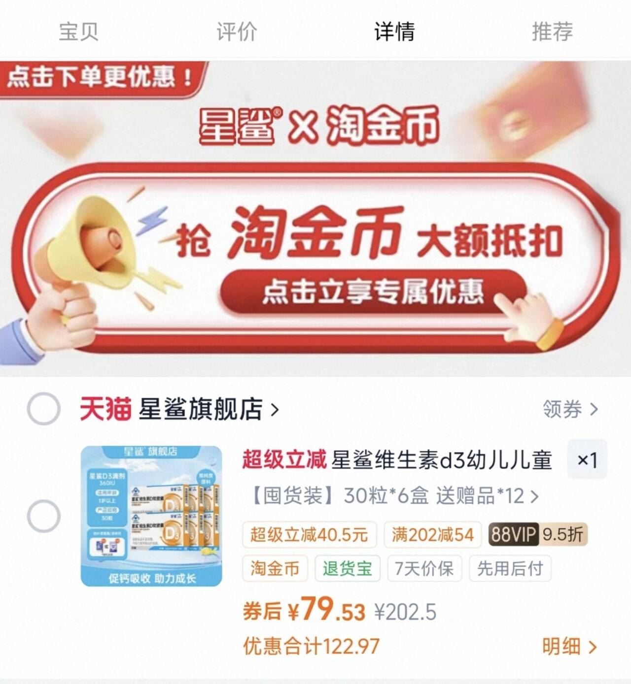 星鲨维生素D3 0.3/粒,星鲨维生素D3+钙 79.5元发报员Z2026年04月22日 00:530举报 速 淘寳搜:省钱卡 领5劵-0.3/粒 星鲨 维生素D3下拉叠18金币vip79.5元 30粒*6盒 钙12粒*4https://m.tb.cn/h.isAjju9科学补VD 促进钙吸收 强健骨骼 家里有娃必囤复制文案