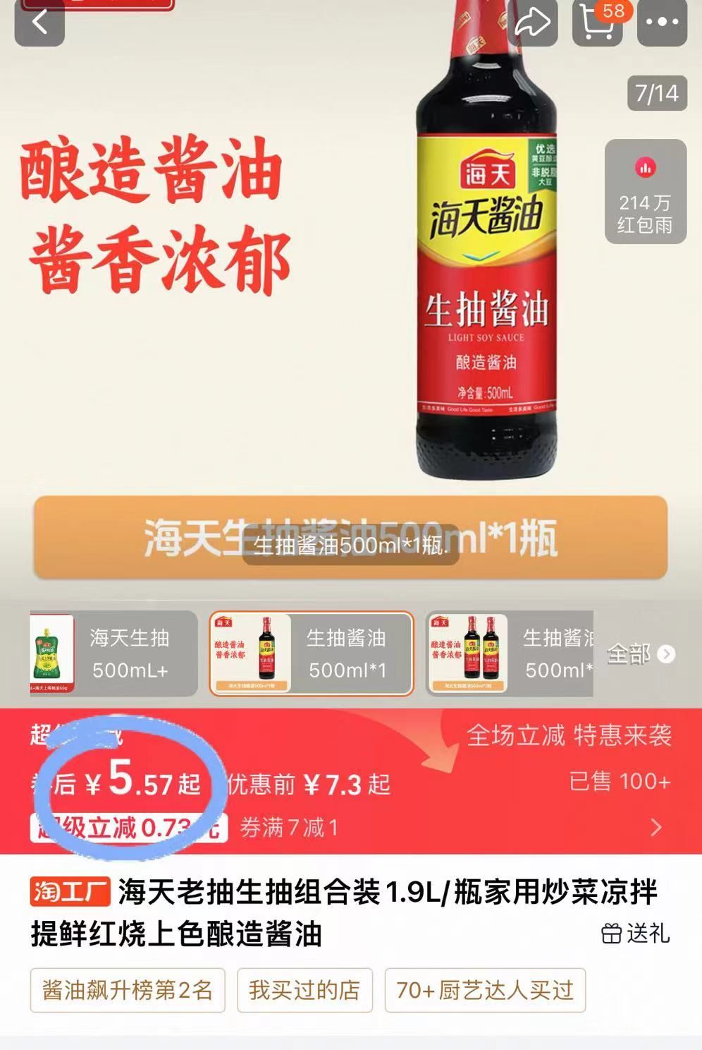 海天老抽生抽500ml 5.5元发报员Z2026年04月22日 13:280举报 5.5元,个位数抢【海天】老抽生抽500ml厨房必备调料 一定要抢啊https://m.tb.cn/h.irzanWy复制文案