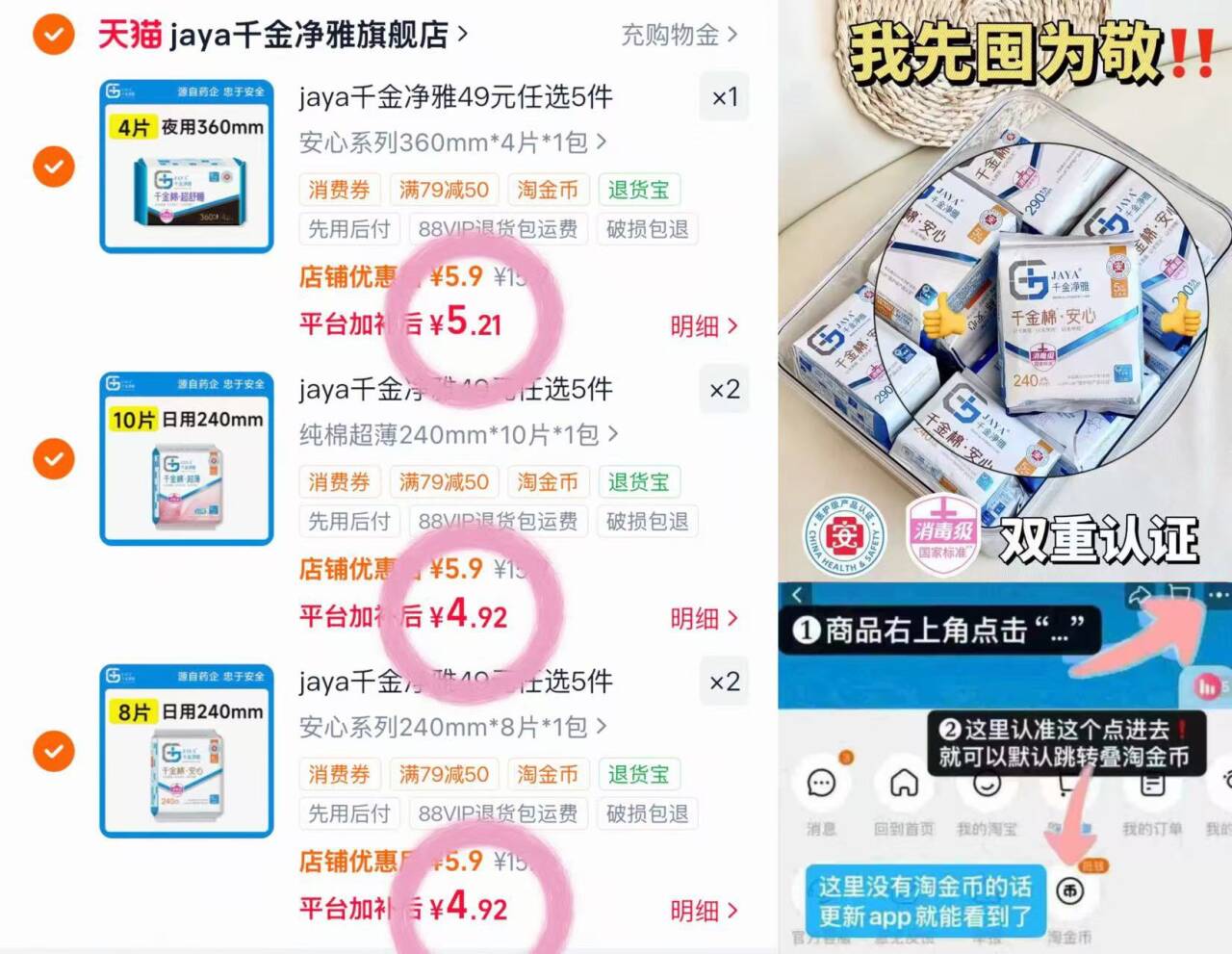千金净雅卫生巾 4.9元/包,千金净雅卫生巾任选5件 24元发报员Z2026年04月22日 16:170举报 4.9元/包 千金净雅卫生巾 ! 看图叠唫币任意 5件 24https://m.tb.cn/h.iHloZwf-Yi护级!!莼棉日夜全周期任选复制文案