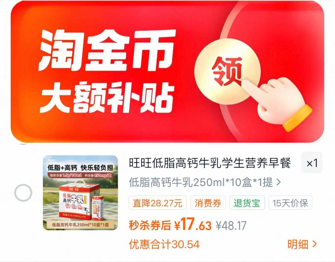 旺旺低脂高钙牛乳250ml*10盒 17.6元发报员Z2026年04月22日 16:340举报 旺旺低脂高钙牛乳250ml*10盒,下拉抵琻币17.6元https://m.tb.cn/h.iHOgIvj复制文案
