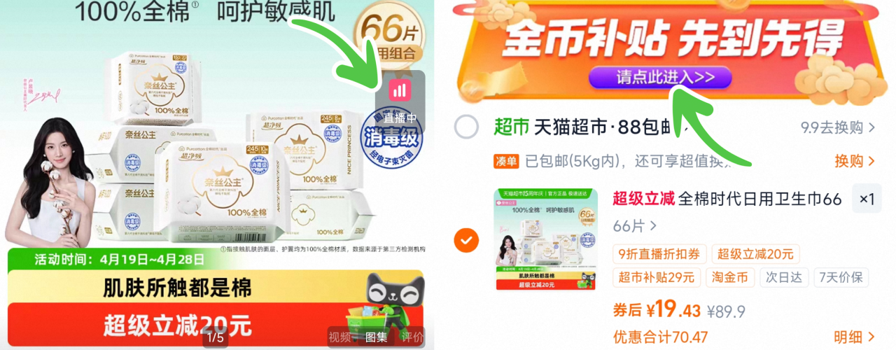 19.4元 折0.2元/片 ①进直播间领9折券 加1件 ②下拉进淘金币 加1件发报员Z2026年04月22日 17:130举报 19.4元 折0.2元/片 ①进直播间领9折券 加1件②下拉进淘金币 加1件③去购物车把数量改为“1”全棉时代全棉卫生巾66片https://m.tb.cn/h.is8p5Zd复制文案