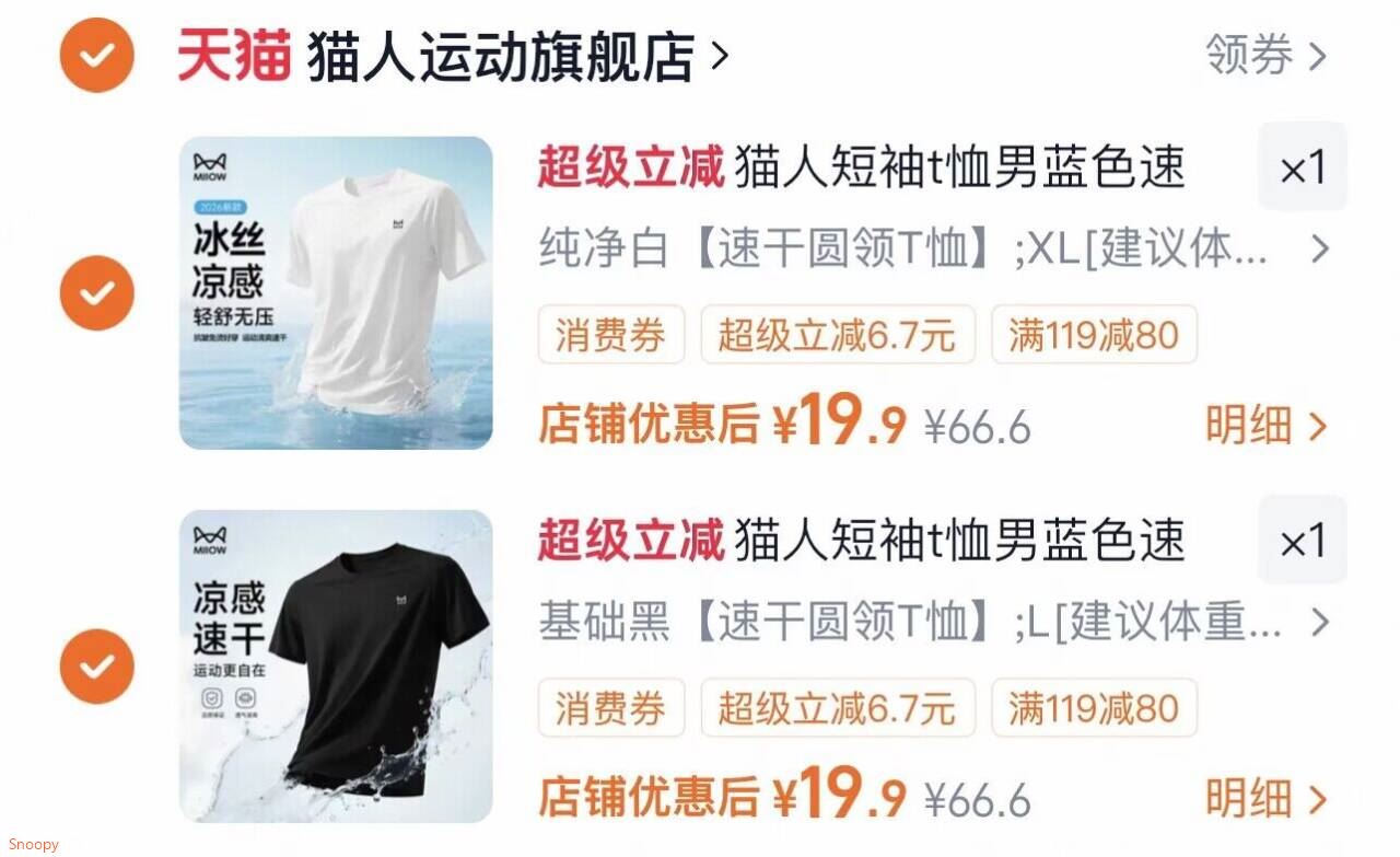 猫人运动男士夏速干短袖拍2件 19.9元/件