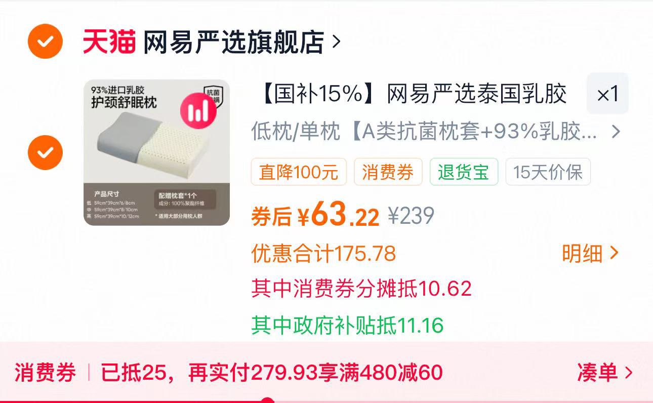 网易严选如胶枕头护颈椎助睡眠枕 63.3元