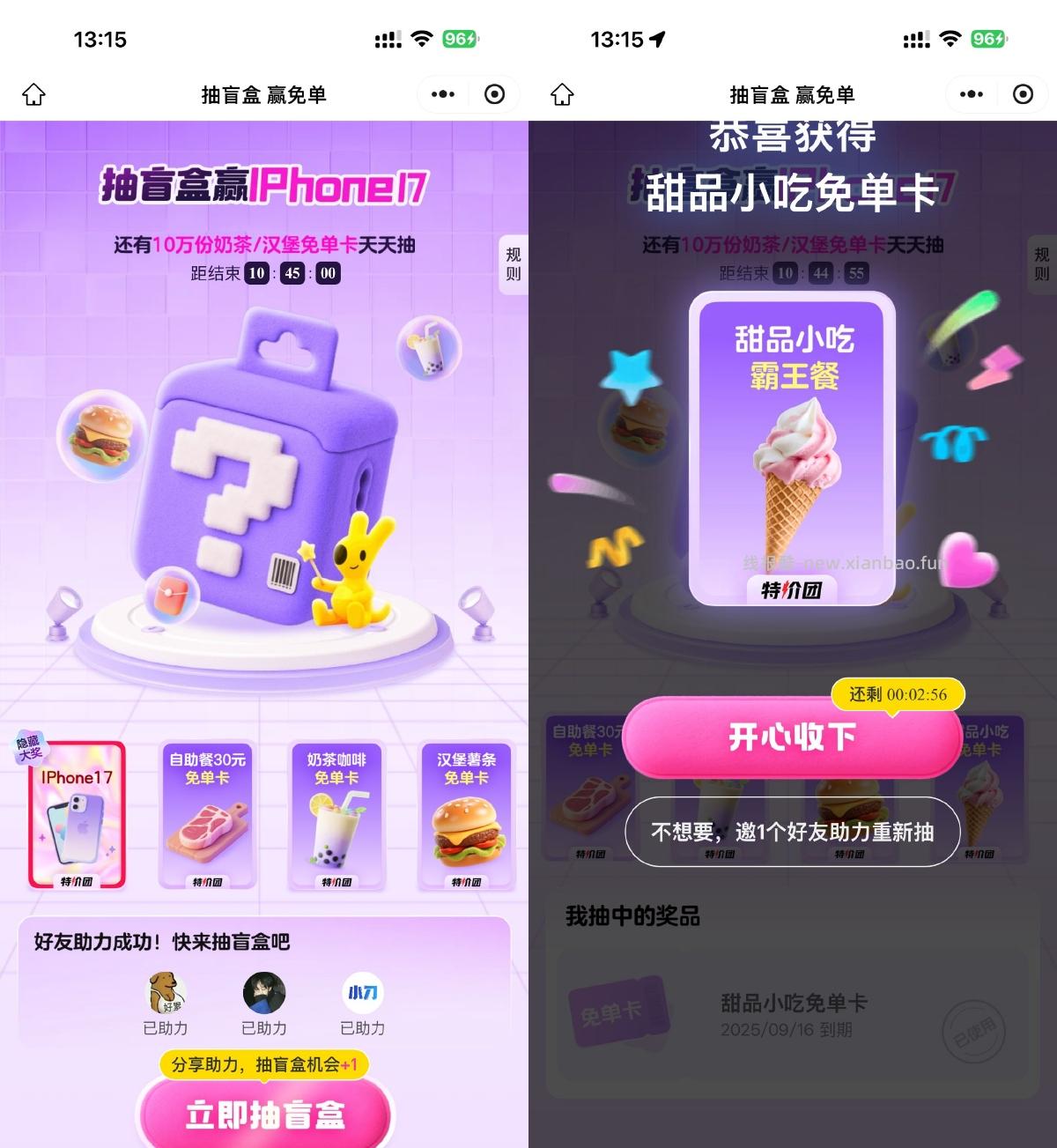 微信打开活动->3人助力抽奶茶或美食免单卡,助力的人也能抽免单卡