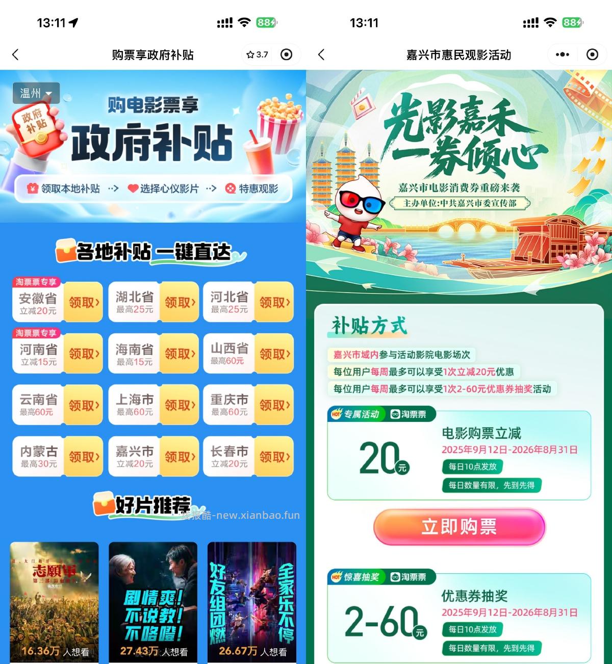 微信打开活动->部分省份或地区有电影票券 或 购票立减,每天10点开始补贴