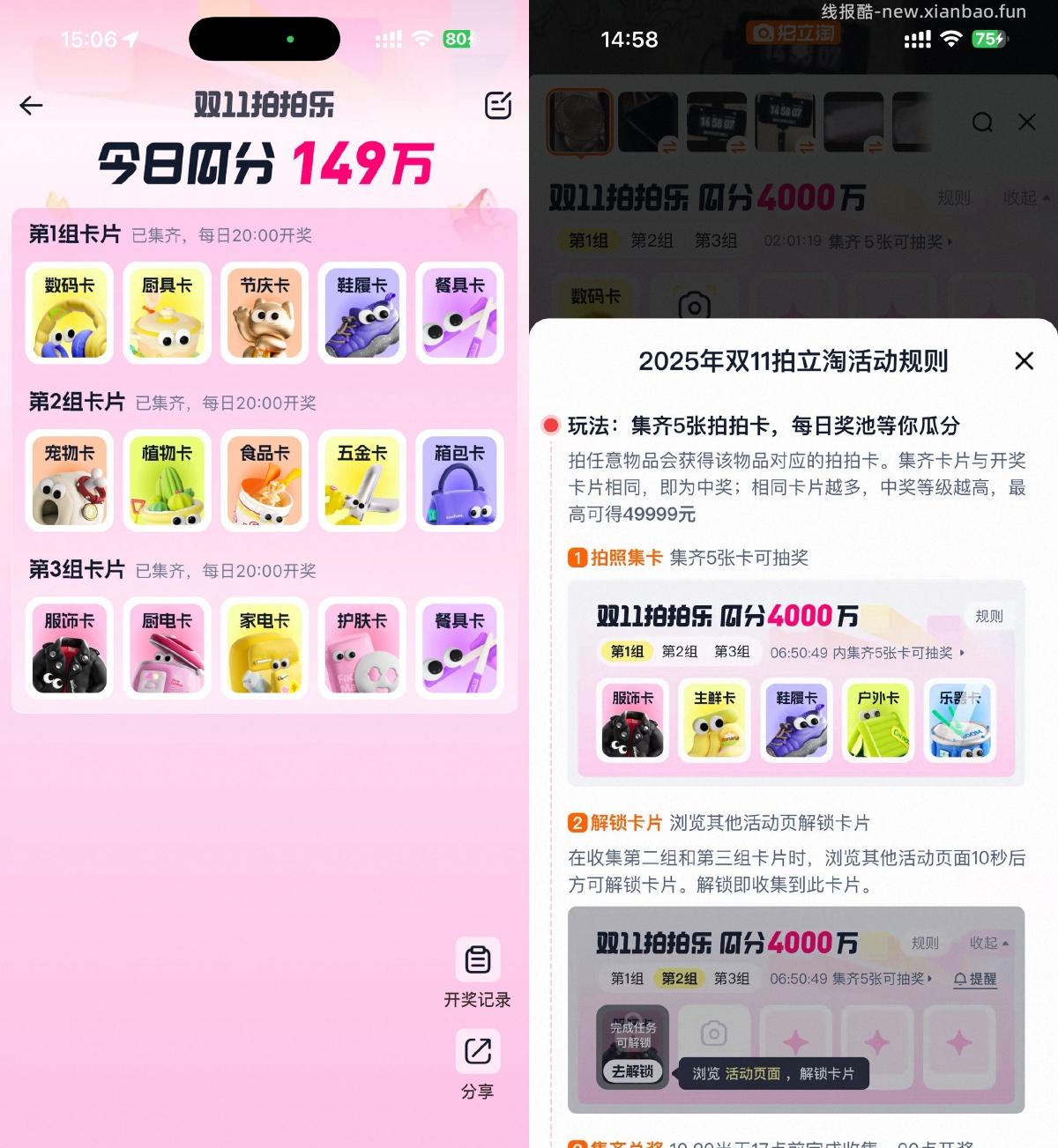 淘宝双11拍拍乐瓜分百万红包小刀2025年10月20日 15:080举报淘宝搜索“拍拍乐”->每天18点前可集齐3组卡片,每晚20点整根据相同的卡片瓜分对应红包卡片合集:https://tb3.cn/AH7EbS复制文案原文地址:https://www.x6d.com/i-wz-30122.html版权声明:本站作为免费线报整合平台,文章快照抓取源于网络。临时存储未经验证,本站不参与任何平台活动,请自行甄别,谨防受骗!