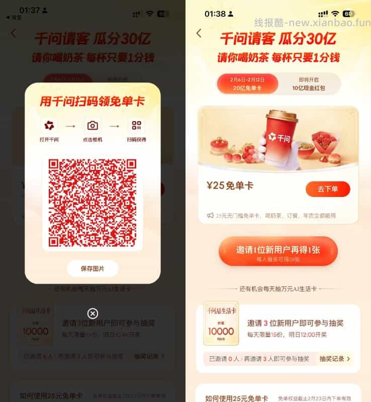 千问APP发送“给我点杯奶茶”->自动领淘宝闪购价值25亓的奶茶免单券,可0.01亓喝奶茶————每邀请1人可得1张奶茶免单券,最多可邀请20人,库存共8千万张免单券!